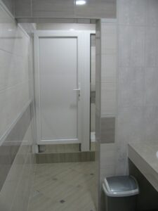 Выполненные работы: демонтаж перегородок и возведение новых, выравнивание стен и устройство стяжки, установка окон, дверей и пластиковых кабинок, монтаж систем кондиционирования, отопления, водоснабжения и канализации, электромонтажные работы, устройство натяжных потолков, изготовление столешницы и облицовка ее плиткой, облицовочные работы.